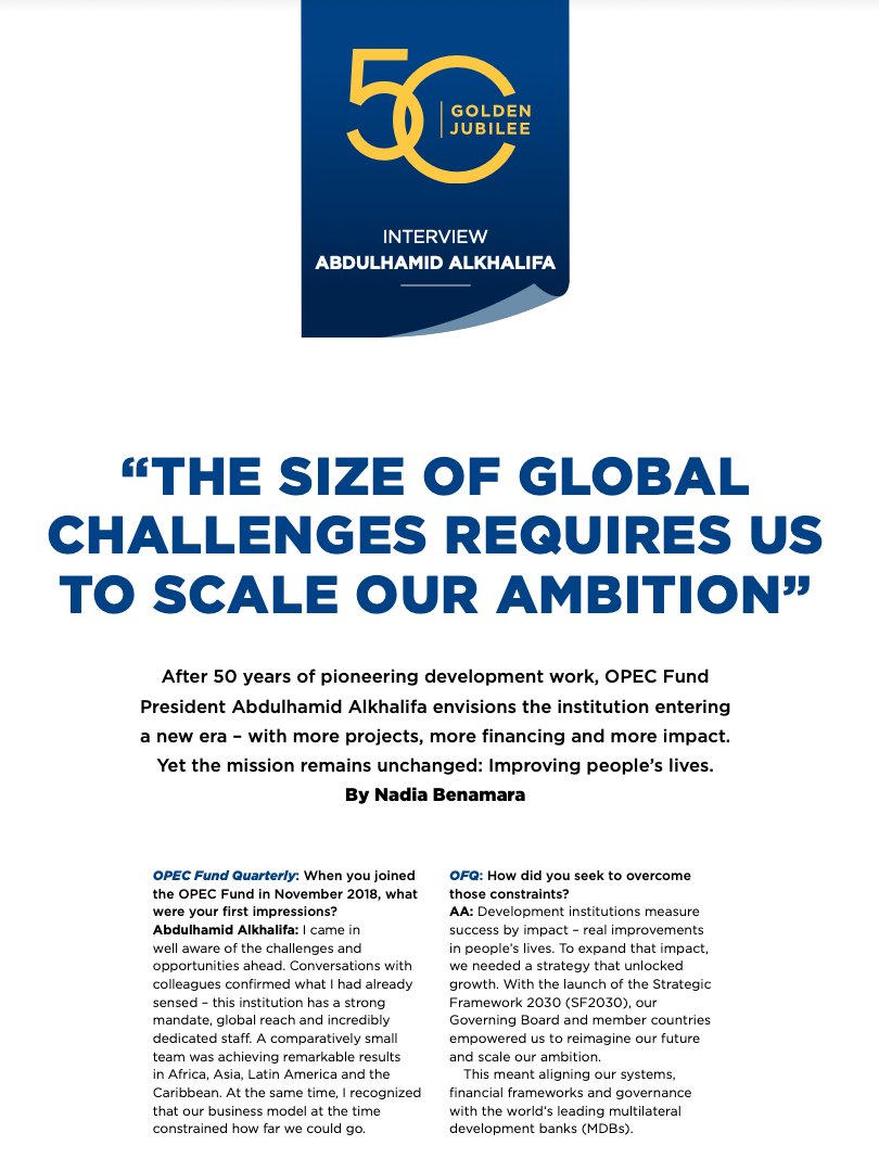 Today, global challenges demand even greater ambition. Through our Strategic Framework 2030, the OPEC Fund is strengthening its ability to deliver impact - expanding its reach, mobilizing new forms of financing, and building innovative partnerships that turn resources into tangible results on the ground.